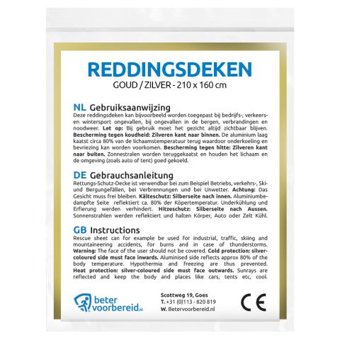 Emergency blanket 210 x 160 cm, staffel 50 stuks. Voorkomt daling en stijging van de lichaamstemperatuur. De deken wordt om het lichaam gewikkeld en vormt een schild tussen het lichaam en de (buiten)lucht. Het refle ...