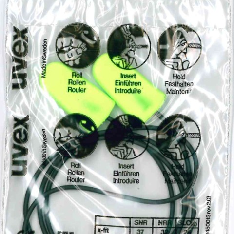 Earplugs oordopjes Uvex X-Fit met koord. Oorpluggen zijn gehoorbeschermers omdat ze schadelijke geluiden reduceren met 37 dB. De oordopjes worden tussen duim en wijsvinger tot een klein staafje gerold en al draaiend ...