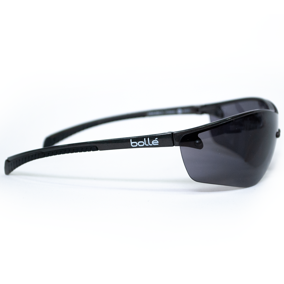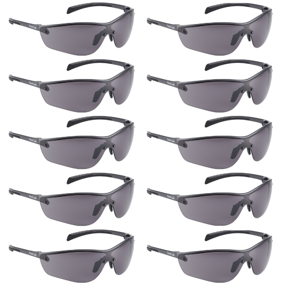 Bollé Silium, model silppsf, staffel van 10 veiligheidsbrillen. Met een gewicht van slechts 22 gram draagt Silium+ zeer comfortabel. Past zich goed aan naar de vorm van het gezicht dankzij de flexibel verstelbare neusbrug. Opvallend zijn de dunne poten die zeer buigzaam zijn en géén drukpunten veroorzaken. De panoramische lens is getint en voorzien van een Platinum coating aan binnen- en buitenzijde. Deze extra beschermlaag houdt de bril vrij van condens en heeft een weerstand tegen krasvorming.